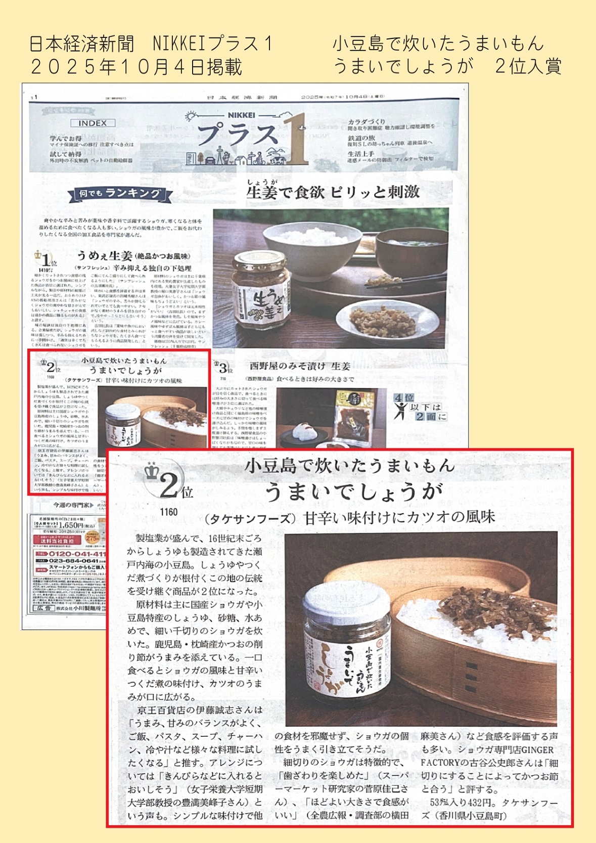 タケサン > お知らせ > 告知 > NIKKEIプラス1 何でもランキングで「小豆島で炊いたうまいもん うまいでしょうが」が選ばれました
