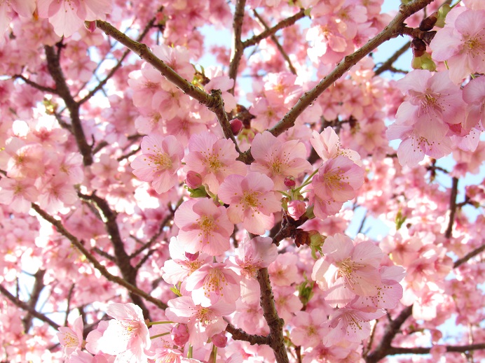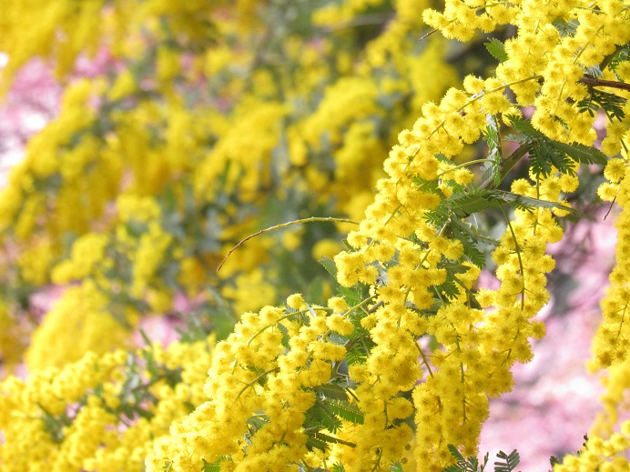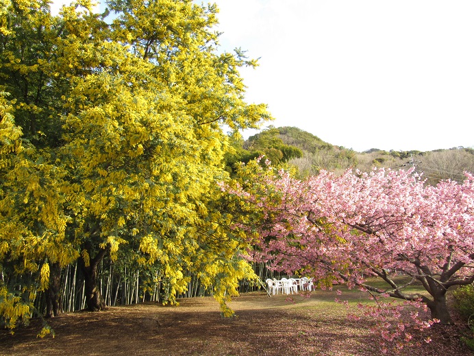 昨日までの雨風で心配しておりましたが、それほど散っておらず一安心。葉が出始めた木もありますが、ほとんどの木が満開を迎え、枝いっぱいに可憐な花を咲かせております。ミモザとの共演も、もう少し楽しめそうです。 |